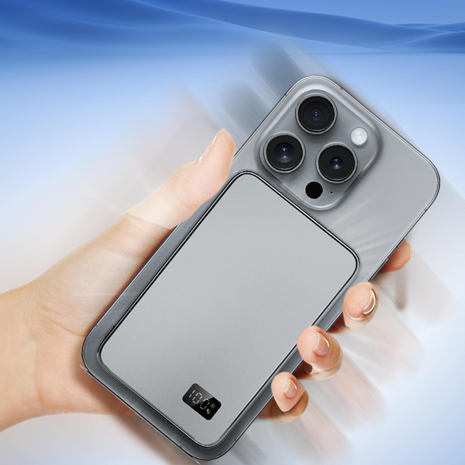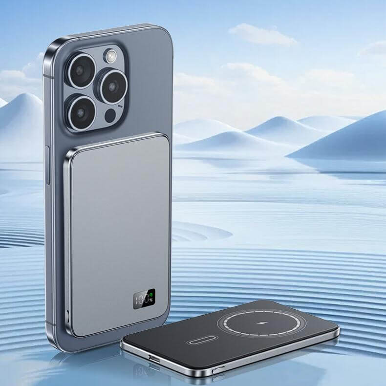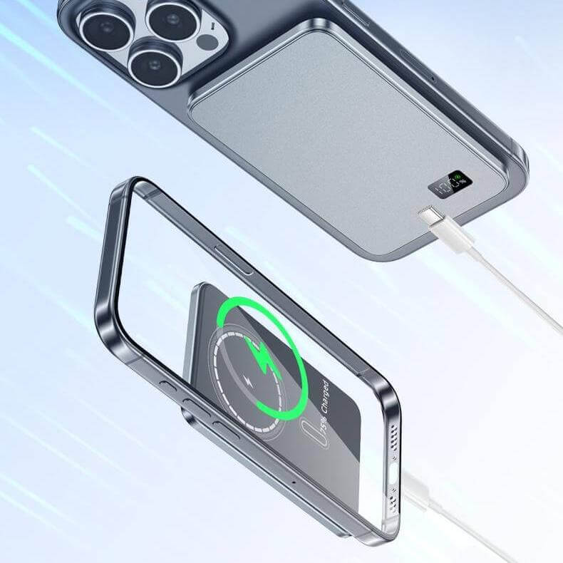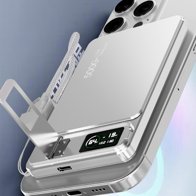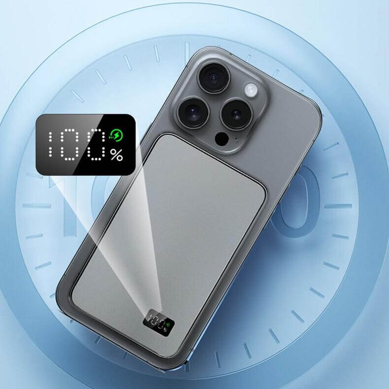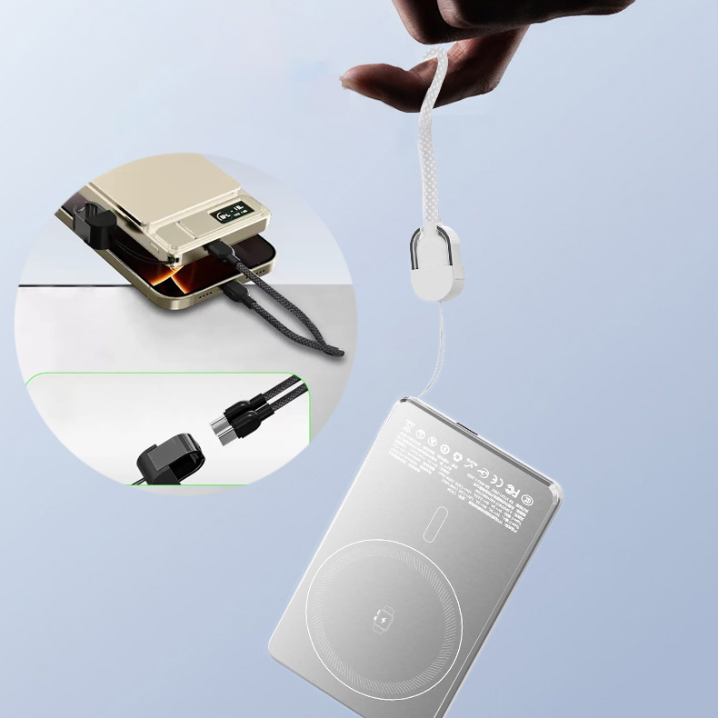 Note: The power bank’s wireless fast charging only supports devices that are compatible with wireless fast charging. If your device does not support wireless fast charging, please use a cable for fast charging. The built-in cable only supports Type-C ports. If you require a different charging port, please use another cable or purchase an additional charging cable.